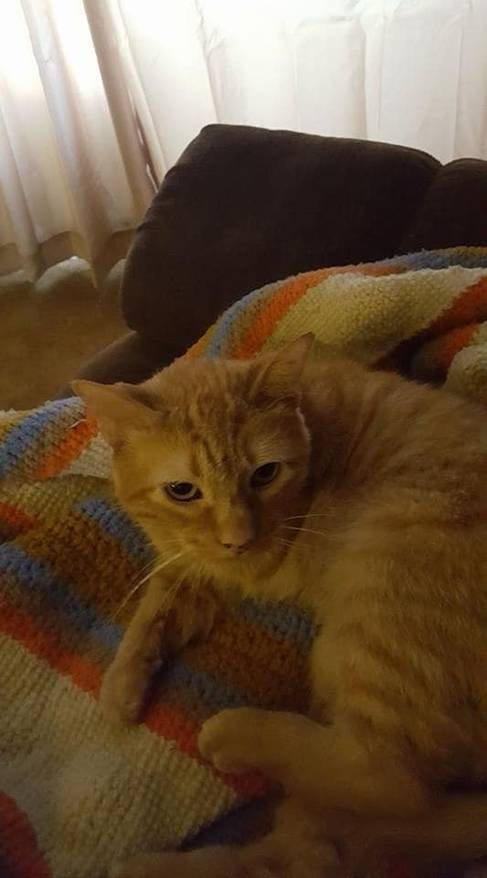 Several years ago, Kelly noticed something unexpected in her yard. "We discovered a tiny orange kitten huddled in our bushes and his leg was dangling in a way that wasn't natural." The cat appeared to be homeless, but Kelly couldn't quite be sure, as the cat wouldn't come out. So, she left him food and water, hoping it would motivate him to trust her and her family. "We quickly realized, though, that this kitten needed medical help," she says. Her entire family attempted to coax him out of the bushes so they could take him to the veterinarian for treatment. "Ultimately, it took my brother-in-law lying down on our driveway and gently meowing at him until he came out!"