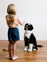 This command ends with your puppy sitting quietly in front of you. It should be practiced with many different people so your puppy learns that the proper way to approach a person is to run up to them and then sit.