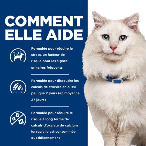 Les nutritionnistes et vétérinaires de Hill’s ont élaboré la nourriture clinique Prescription Diet c/d Multicare Stress, spécialement formulée pour soutenir la santé urinaire des chats et aider à la gestion du stress. Testée en clinique, la nourriture c/d Multicare est formulée pour réduire de 89 % la récurrence des signes urinaires les plus courants.